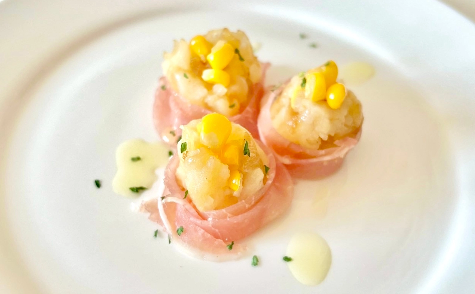 - 器にじゃがいもを盛り付け、上から⑧を盛り付ける。